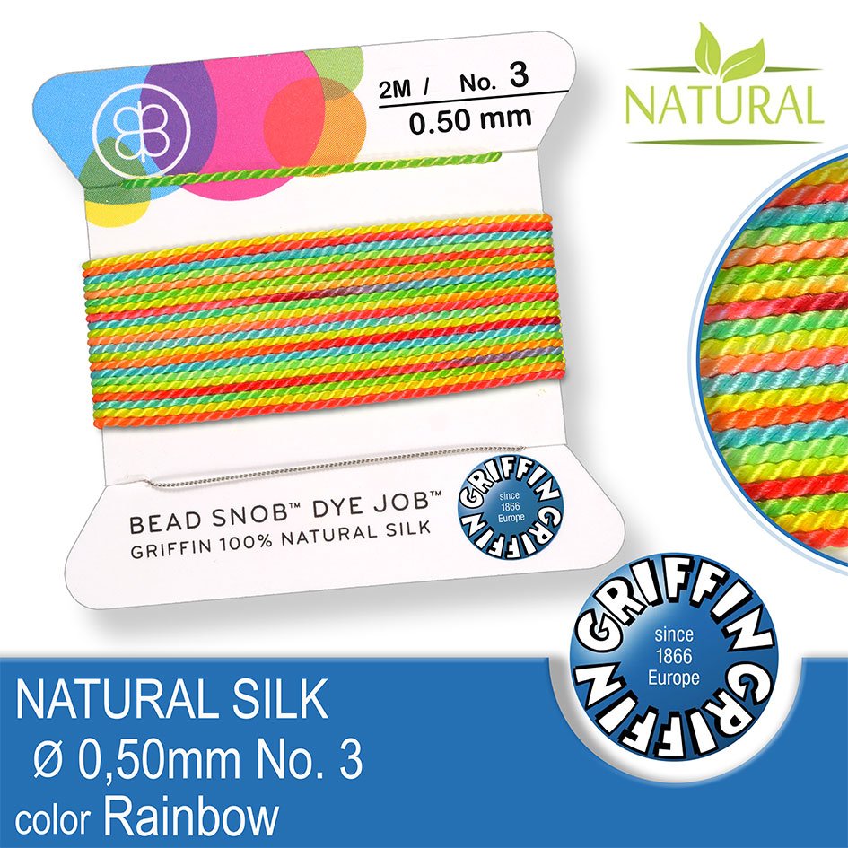 Hedvábná nit s jehlou GRIFFIN síla nitě 0,5mm No.3 délka 2m. Barva Rainbow.