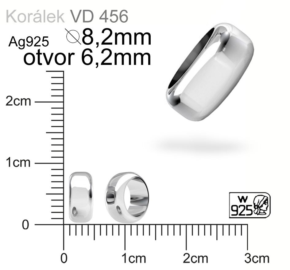 Korálek s velkým otvorem ozn. VD456.Velikost pr. 8,2mm otvor 6,2mm. Materiál STŘÍBRO Ag925.váha 0,59g.