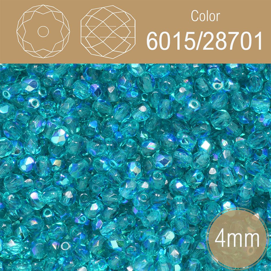 Korálky BROUŠENÉ 4mm. Barva 6015/28701 Průhledná tyrkysová s pokovem AB. Balení 120Ks.