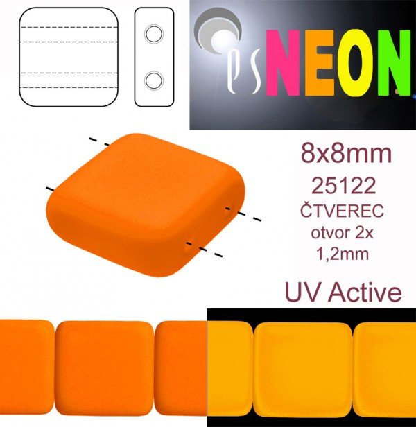 Korálky čtverec 2 otvory NEON (UV Active) velikost 8x8mm barva 25122 oranžová. Balení 15Ks.