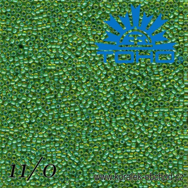 Korálky TOHO tvar ROUND (kulaté). Velikost 11/0. Barva č.947-Inside-Color Lime Green/Opaque Green Lined . Balení 8g.