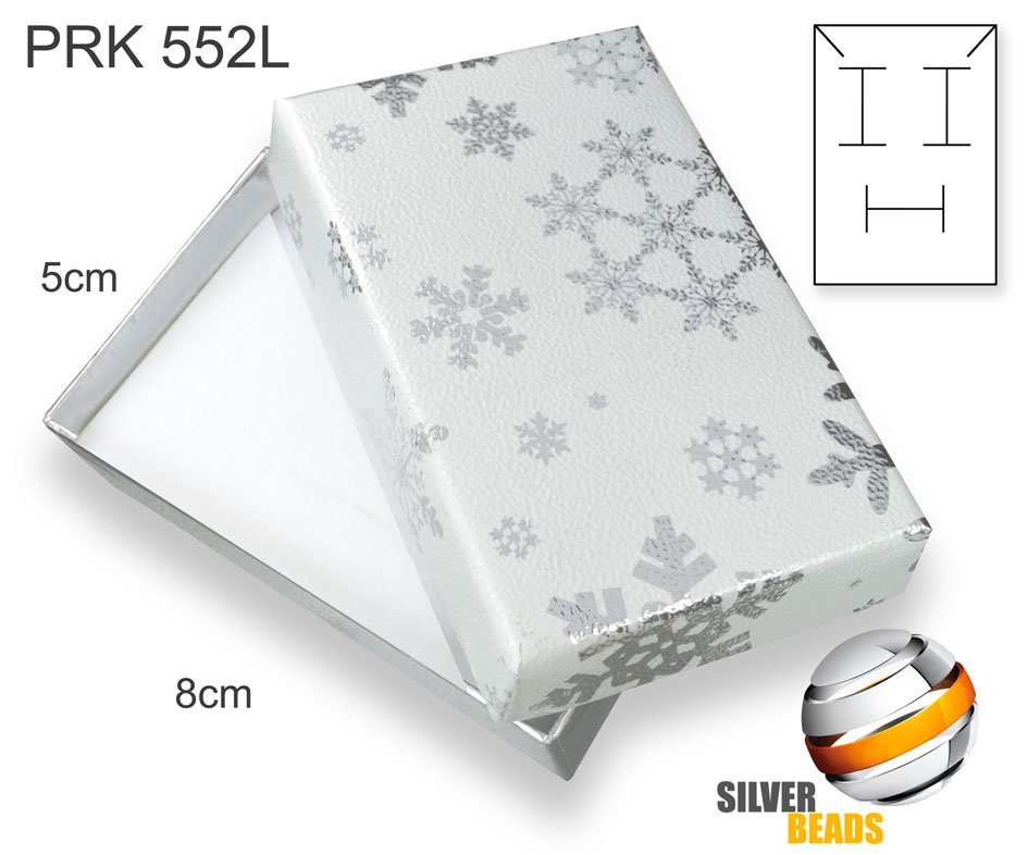 Krabička na šperky. Materiál papír+mašle. Ozn. PRK 552L Barva Bílo/Stříbrná s potiskem VLOČKY (stříbrná barva). Velikost 5,0x5,0cm výška 3,5cm. V pravé části nákres řezů vnitřní vložky. Materiál vložky molitan+bílá semiš.