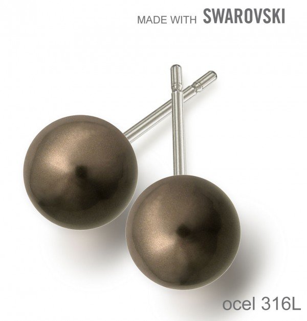 Náušnice sada Made with Swarovski. Komponent Voskovaná perle Swarovski 5818 barva Crystal Brown Pearl (001 815). Komponent puzeta náušnice chirurgická ocel 316L. Celková velikost 8x15mm. Součástí dodávky jsou silikonové zarážky na zajištění náušnic.