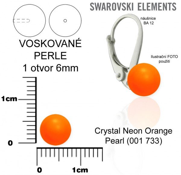 Voskované perle SWAROVSKI barva CRYSTAL NEON ORANGE PEARL (001 733). Velikost kuličky 6mm. Velikost otvoru 0,8mm. Otvor je pouze z jedné strany není průchozí. Na obrázku je ilustrační foto použití náušnice není součástí dodávky. Na obrázku je náušnice AG925 ozn.BA 12.