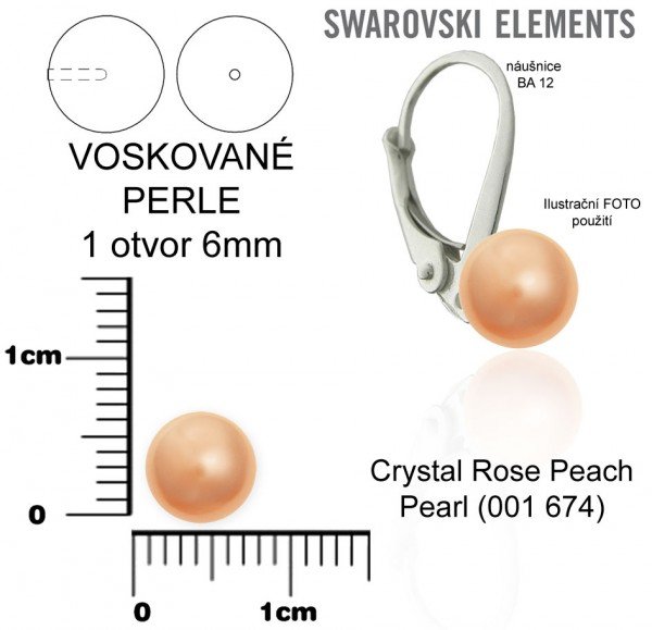 Voskované perle 5118 SWAROVSKI barva CRYSTAL ROSE PEACH PEARL (001 674). Velikost kuličky 6mm. Velikost otvoru 0,8mm. Otvor je pouze z jedné strany není průchozí. Na obrázku je ilustrační foto použití náušnice není součástí dodávky. Na obrázku je náušnice AG925 ozn.BA 12.